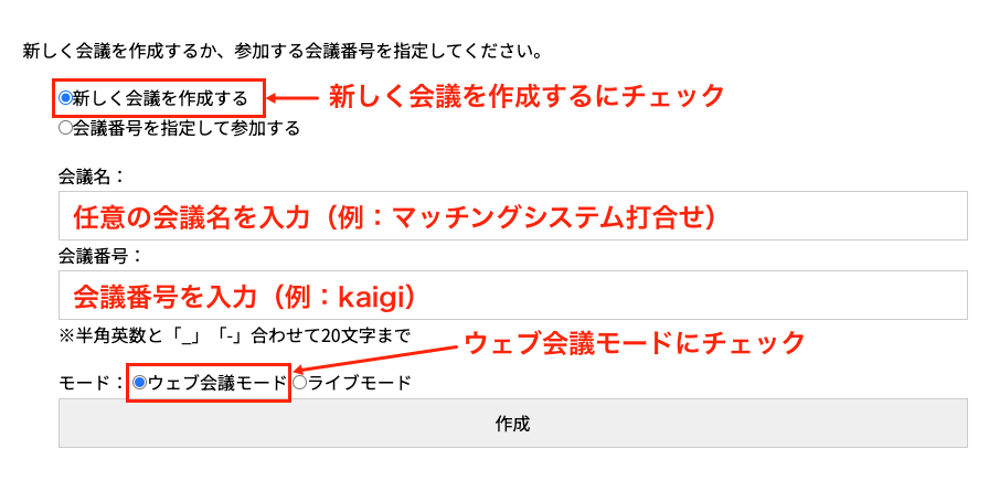 「新しく会議を作成する」を選択し、任意の会議名と会議番号(例:kaigi)を入力します。モードで「ウェブ会議モード」を指定して「作成」をクリックすると、会議が開始されます。