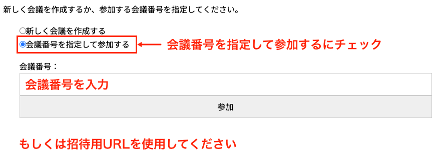 「会議番号を指定して参加する」をチェックしてください。もしくは招待用URLを使用してください。