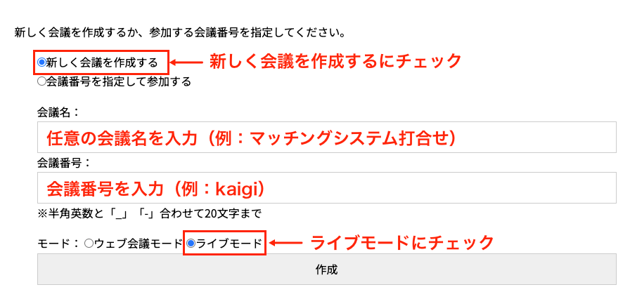 「新しく会議を作成する」を選択し、任意の会議名(例:マッチングシステム打合せ)と会議番号(例:kaigi)を入力します。モードで「ライブ配信モード」を指定して「作成」をクリックすると、配信が開始されます。